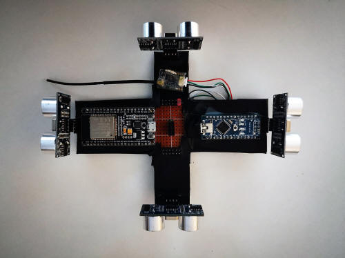 Abbildung 1: Platine der Drohne mit Mikrocontrollern, Ultraschallsensoren und Empfänger