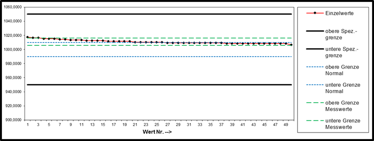 | Spezifikationswerte | Gemessene Werte | Statistische Werte | 1008,4604 | 1050,0000 | 950,0000 | 1010,0000 | 990,0000 | 1016,2171 | 1005,7037 | ||||||||||||||||||
