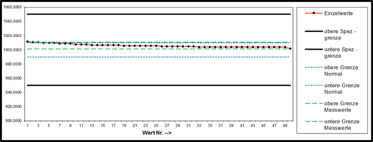 | Spezifikationswerte | Gemessene Werte | Statistische Werte | 1003,7958 | 1050,0000 | 950,0000 | 1010,0000 | 990,0000 | 1010,5678 | 1001,1839 | ||||||||||||||||||