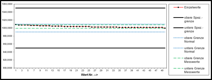 | Spezifikationswerte | Gemessene Werte | Statistische Werte | 1001,6561 | 1050,0000 | 950,0000 | 1010,0000 | 990,0000 | 1007,8834 | 999,3889 | ||||||||||||||||||