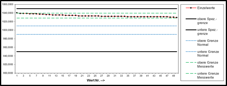 | Spezifikationswerte | Gemessene Werte | Statistische Werte | 1031,2430 | 1050,0000 | 950,0000 | 1010,0000 | 990,0000 | 1039,2987 | 1028,0673 | ||||||||||||||||||||||||||||