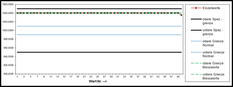 | Spezifikationswerte | Gemessene Werte | Statistische Werte | 1040,2159 | 1050,0000 | 950,0000 | 1010,0000 | 990,0000 | 1041,5301 | 1038,7017 | ||||||||||||||||||||||||||||