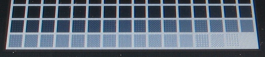 am besten sichtbar, wenn LCD von oben betrachtet wird. Rahmen Schwarz, obere Zeile Grautöne 1 bis 7, Zeile 2 und 3 sind Pixel-Schachbrettmuster aus 0 und den Grautönen 1 bis 7: eine der unteren Zeilen wird sich unterscheiden wenn Dithering benutzt wird.