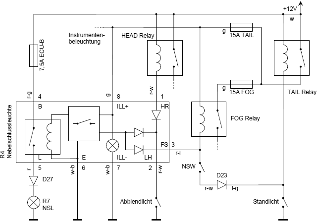 Die Nebelschlussleuchte darf nur bei Abblendlicht oder eingeschalteten Nebelscheinwerfern zuschaltbar sein. Durch einen Taster wird das im Schalter integrierte NSL-Relais abwechselnd ein- bzw. ausgeschaltet. Rekonstruktion des Schaltungsaufbaus: