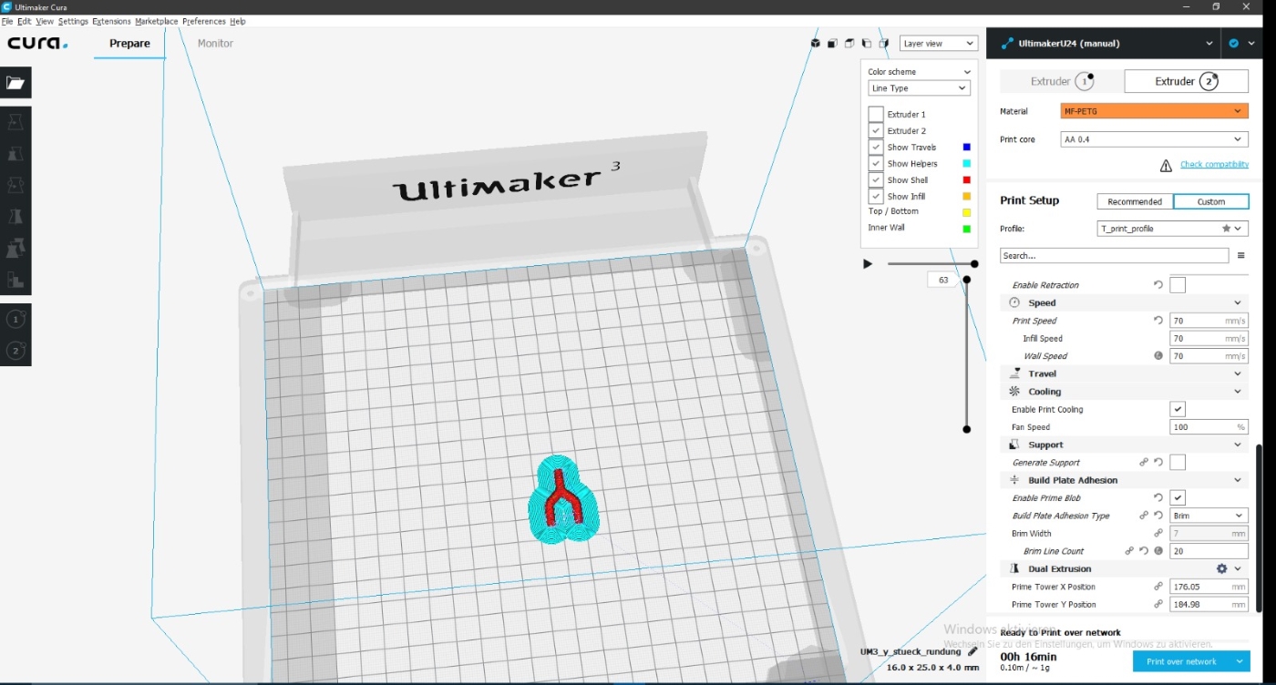 Alle 3D gedruckten Bauteile werden mit der Software Ultimaker Cura vorbereitet und mit dem Ultimaker 3 hergestellt.