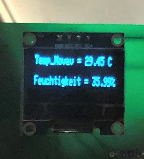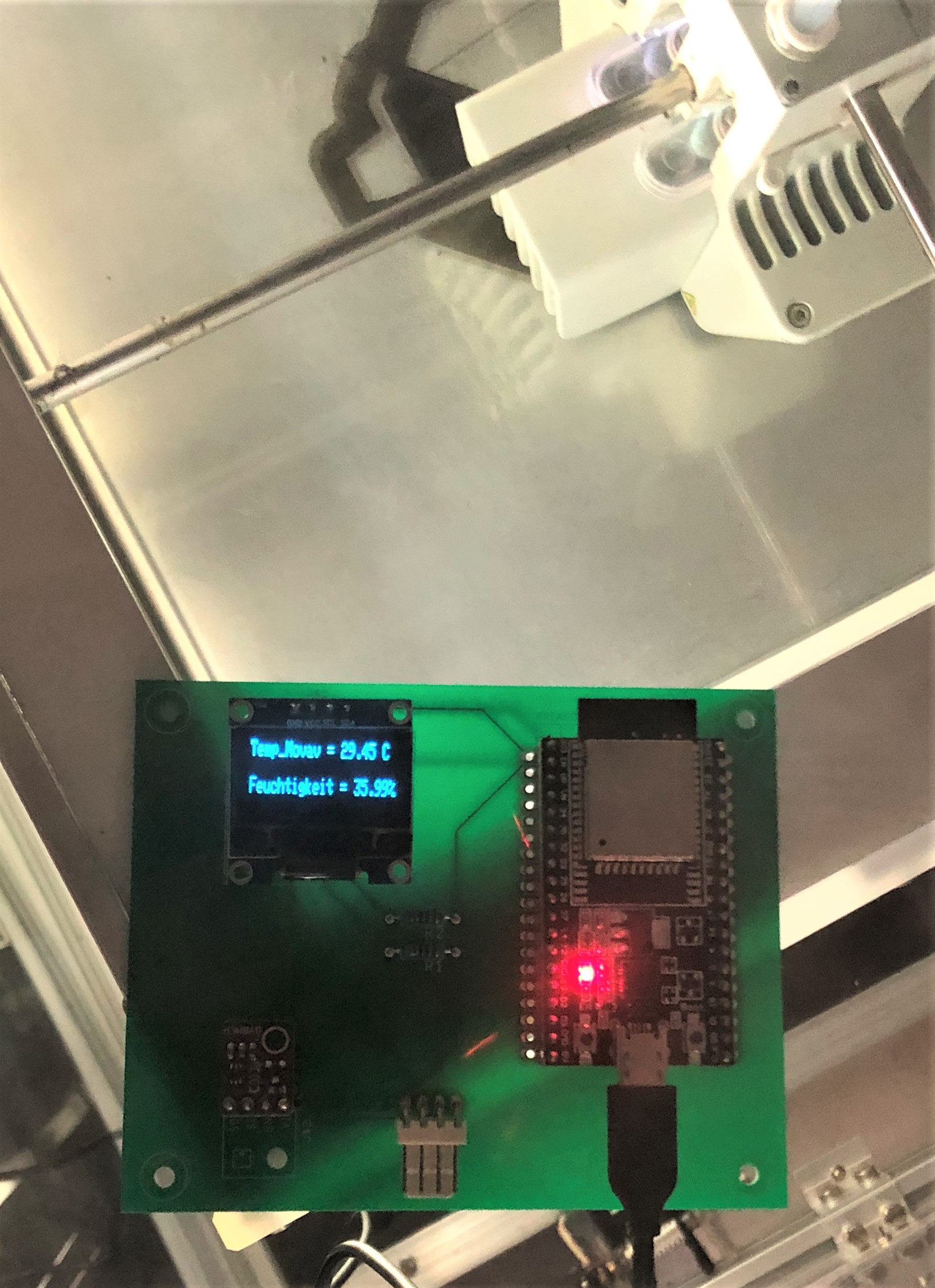 Um zu überprüfen, ob die Theorie bezüglich der Luftfeuchtigkeit und der Temperatur stimmt, wird mithilfe eines Luftfeuchtigkeits- / Temperatursensors und eines Mikrocontrollers (ESP 32) die Feuchtigkeit in der Luft und die Temperatur gemessen. Die Daten werden dann direkt mittels eines kleinen Displays ausgegeben. Der Mikrocontroller wird mittels einer Powerbank mit Strom versorgt. Damit eine möglichst genaue Messung entsteht, wurde versucht den Sensor so nah wie möglich am Druckvorgang zu platzieren. Hierfür wurde der Aufbau oben auf den Drucker gelegt, ohne den Verfahrweg der Extruder zu stören.