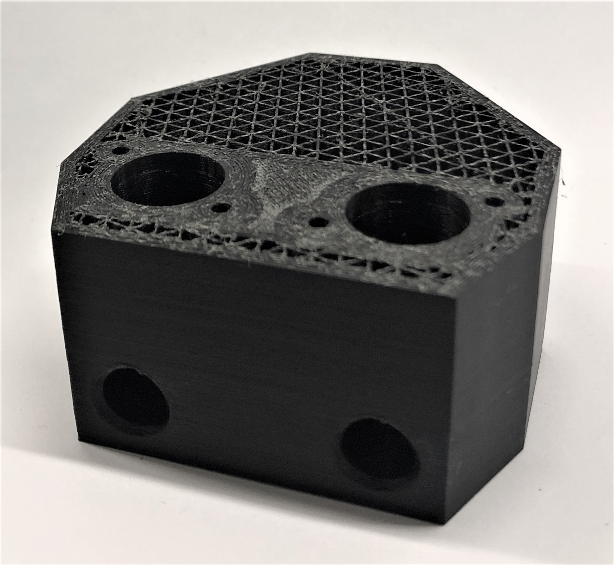 Die Wanddicke beträgt 1,3 mm, wobei deren Ausführung auf 10 erhöht wurde, um die Fülldichte auf 50 % reduzieren zu können, ohne dass die Dichtigkeit beeinflusst wird. Das Verringern der Fülldichte spart nicht nur Zeit ein, sondern gleichzeitig auch Material.