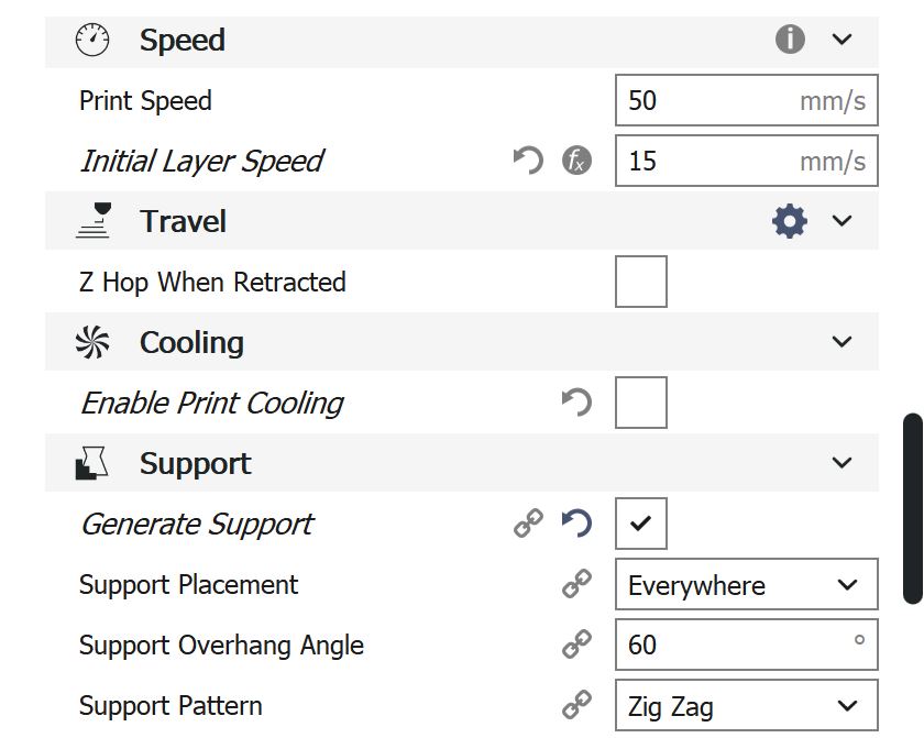 Da es sich hierbei um ein viel größeres und massiveres Bauteil handelt im Gegensatz zu dem Testbauteil, müssen die Einstellungen in Cura angepasst werden.