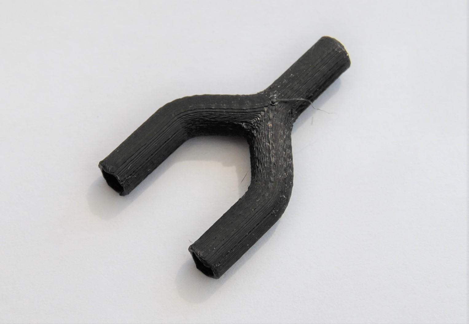 Für den zweiten Probedruck wird das Material PA (Nylon) verwendet. Auch hier konnte das Y-Stück in vertikaler Ausrichtung gedruckt und somit auf Support verzichtet werden. Ein weiterer Vorteil des vertikalen Druckens ist, dass keine Filamentreste am Bauteil zurückbleiben, die das Y-Stück beim Entfernen schädigen könnten.