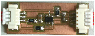 Der Schaltplan und das Board wurde mit Hilfe von EAGLE erstellt. Die Platine wurde von Herrn Stumpf gefräst. Bestückt und gelötet haben wir die 0805-Widerstände, Kondensatoren sowie die Steckverbindungen selbst. Die Platine ist so klein dass sie problemlos auf dem Sensor angebracht werden kann. Durch Verwendung der I2C Schnittstelle kann der Sensor nun überall am EVOLO angebracht werden.