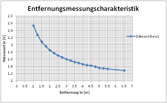 Zur Validierung des Sensors mussten wir die charakteristische Entfernungsmessungskurve aufstellen. Hierzu haben wir den im Datenblatt angegebenen Messbereich von 100-550cm abgedeckt. Gemessen wurde auf ein weißes, DIN A2 Papier. Die Gemessene Analogspannung wurde per ADC-Wandler in eine I2C Signal gewandelt und mit Hilfe des SMT32 Discovery Boards abgefragt. Im Prozessor wurden die Messwerte nun wieder einen analogen Wert gewandelt. Die Messwerte haben wir in Excel ausgewertet.