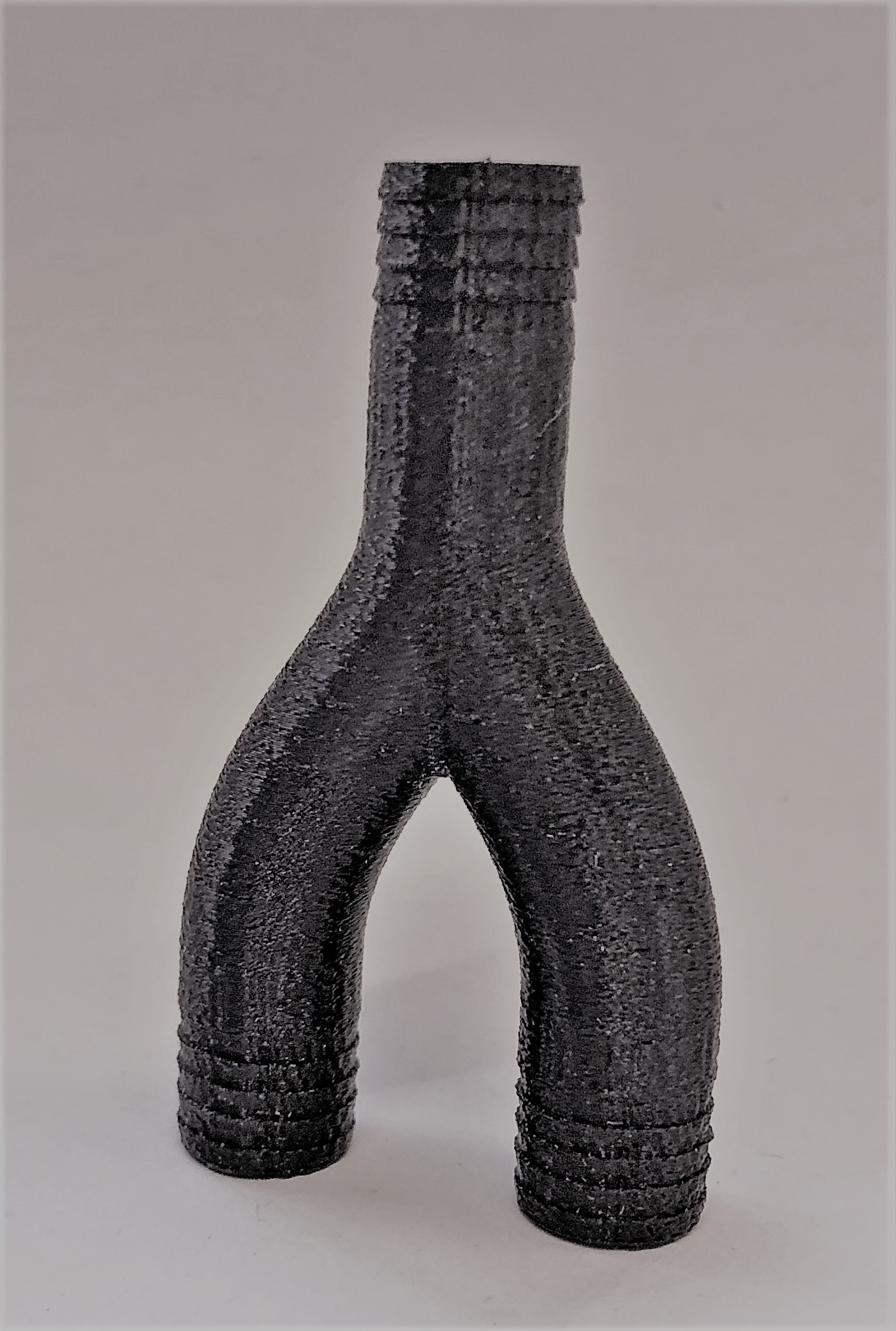 Um zu überprüfen, ob sich das Y-Stück nun im Stehen drucken lässt, wurde es zuerst mit PETG gedruckt. Nach einigen Versuchen entstand auch hier ein gutes Ergebnis (Abb.: Y-Stück V4 3D-Druck aus PETG), dass sich jedoch nach den Dichtigkeitstests als undicht erwies. Durch Lackieren wurde das Bauteil fast komplett dicht, wodurch sich ein Lack durchaus als eine Form der Nachbearbeitung erweist. Jedoch sollte bei der Auswahl des Lacks darauf geachtet werden, dass dieser nicht mit Sauerstoff reagiert oder schädliche Dämpfe freisetzt, die dem Patienten schaden könnten. Beim 3D-Druck mit PA konnten allerdings Cura Einstellungen gefunden werden, die es ermöglichen, das Y-Stück bis mindestens drei Bar dicht zu drucken, weshalb auf das Lackieren verzichtet werden kann. Der Download der *.gcode-Datei zum 3D drucken befindet sich hier. Verbindungsstück 1