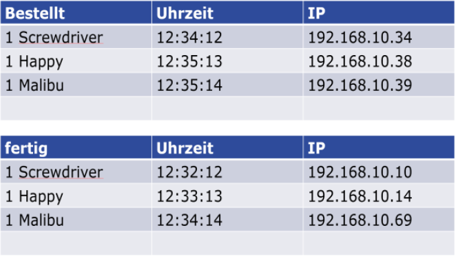 Cocktailbestellungen für den "Mixmaster" per Handy über WLAN sollen zukünftig einer Warteliste und nach Fertigstellung einer Abholliste hinzugefügt werden.