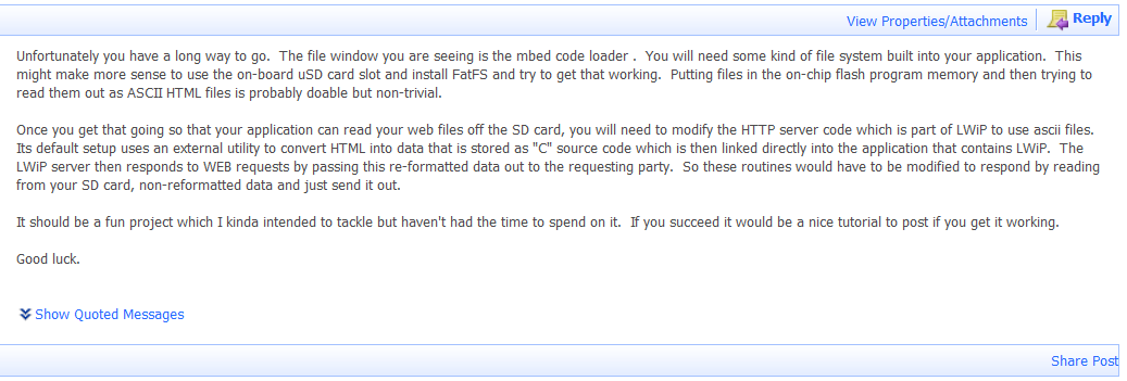 Um die eigene Website im Code einzubinden und aufzurufen, war eine intensive Einarbeitung in den Quellcode erforderlich. Es wurde zunächst versucht, die aufgerufene html-Seite zu verändern. Anschließend wurde der Aufruf der Internetseite angepasst, sowie versucht die Bilder zu ändern. Da diese Ansätze fehlschlugen, wurde vermutet, dass die Startwebsite von einer anderen Index-Datei aus aufgerufen wird. Dementsprechend wurden verschiedene mögliche Dateien untersucht. Weiterhin wurden auf dem STM-Board (im Explorer) nach versteckten Dateien gesucht, ob die Websites hier gespeichert werden. Nachdem auch hier keine Lösung gefunden werden konnte, wurde eine Anfrage im Anfrage im ST-Forum gestellt, um Hilfe von anderen STM32F7xx-Entwicklern zu bekommen. Daraufhin erhielt die Gruppe folgende Antwort: