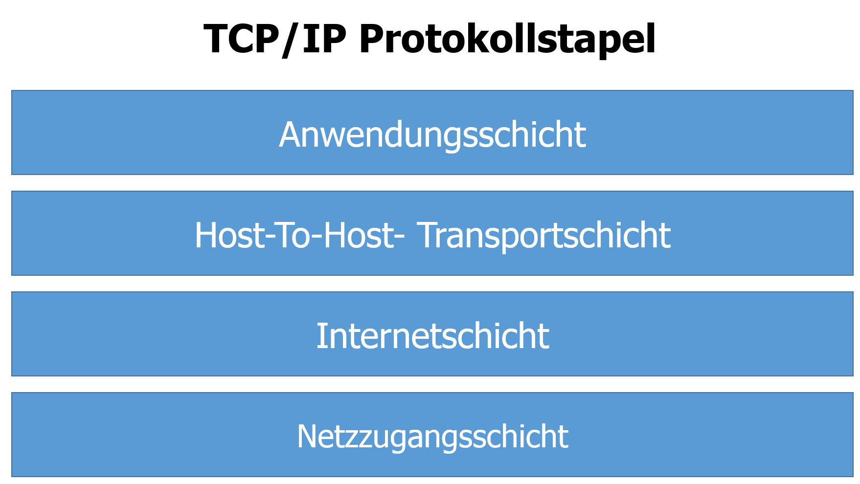 TCP/IP steht für "Transmission Control Protocol/Internet Protocol" und stellt den Standard-Protokollstapel für Anbindungen an das Internet dar, wodurch Datenpakete zwischen Netzwerkteilnehmern ausgetauscht werden können. Dieser Stapel besteht ebenfalls aus vier aufeinander aufbauenden Schichten, siehe Abbildung.