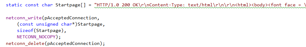 Als alternativer Ansatz wurde die Umsetzung mithilfe des cross-platform Tools "Visual GDB" für embedded Systeme in Visual Studio gewählt. Hierfür wurde "Visual Studio Enterprise 2015 With Update 1" verwendet und die Optionen für C++ nachinstalliert. Anschließend wurde "VisualGDB" (V 5.2) in der 30 Tage Testversion von visualgdb.com gedownloadet und installiert. Die Inbetriebnahme wurde nach der Anleitung für den STM32F46NG von VisualGDB durchgeführt und der Webserver erfolgreich im Browser aufgerufen. Im "static const char Startpage" (im Originalcode ursprünglich "HelloWorld") wird die Website per http festgelegt, siehe Abbildung.