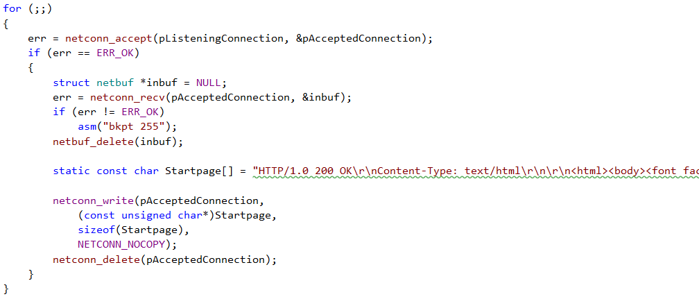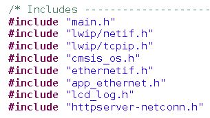 In der Funktion "StartThread(void const * argument)" wird der TCP/IP-Stack erstellt und der lwIP-Stack initialisiert. Danach wird die Webserver-Demo initialisiert über die Funktion "http_server_netconn_init()". Diese ist in der Datei "httpserver_netconn.c" definiert.