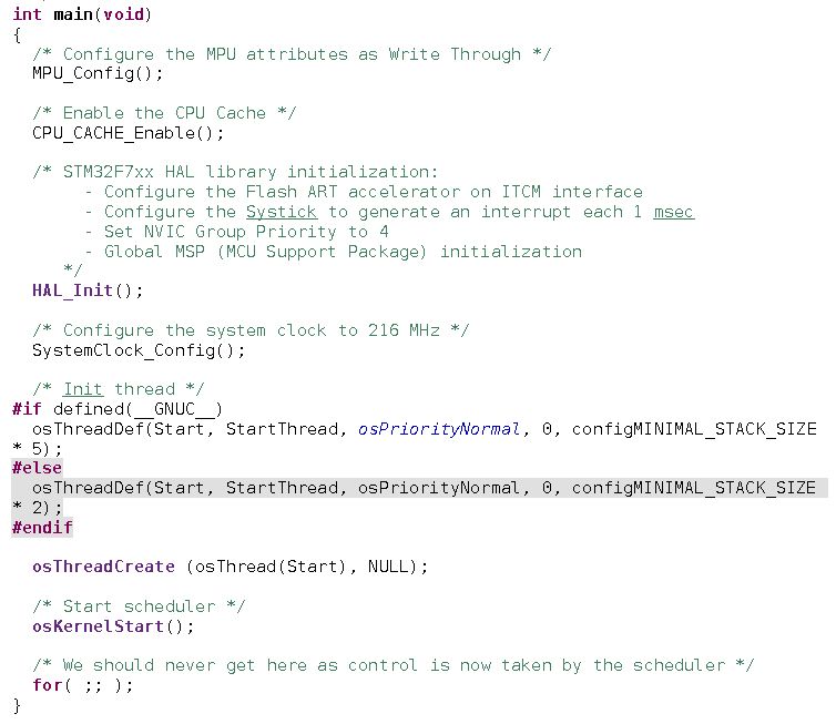 In der int main(void), siehe Abbildung, werden MPU konfiguriert, der CPU Cache aktiviert sowie die HAL initalisiert. Die Systemclock wird konfiguriert und die Funktion "StartThread" in einem Thread aufgerufen. Dann wird per "osKernelStart()" der Scheduler gestartet.