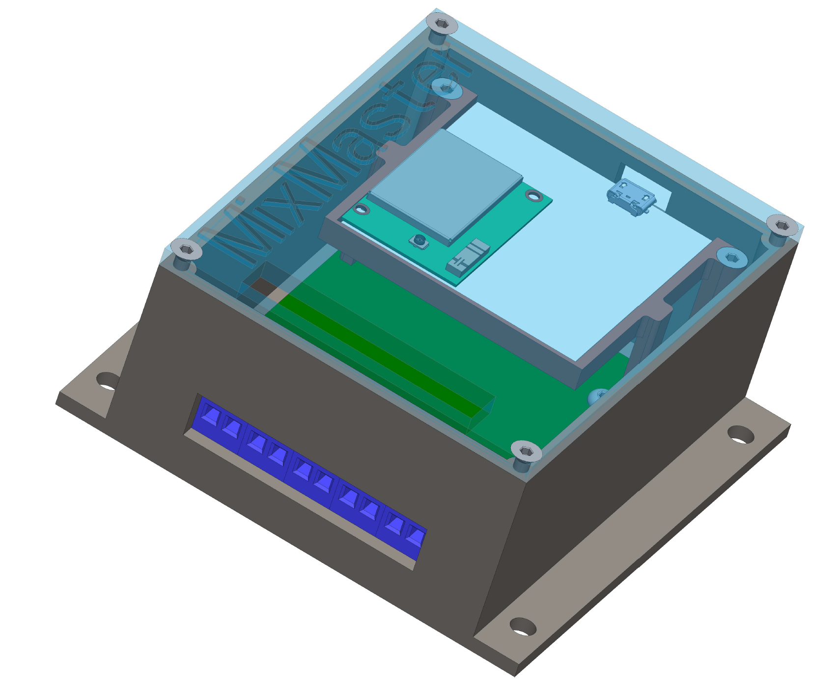 | Um den gesamten Aufbau zu schützen, wird ein Gehäuse mittels CAD entworfen und anschließend auf einem 3D-Drucker gefertigt. Abschließend wird das Gehäuse mit einem gravierten Deckel aus Plexiglas verschlossen. Im Deckel befindet sich eine Öffnung, um einfach an den Verschraubungen der Kabel der Relais arbeiten zu können. Die Kabel werden über eine Öffnung am Gehäuse direkt an den Klemmungen der Mosfet-Treiber-Platine angeschlossen. |