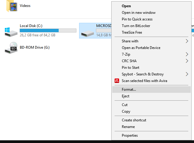 Rechts-Click auf das microSD-Laufwerk und auf "Format" clicken.