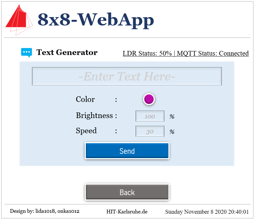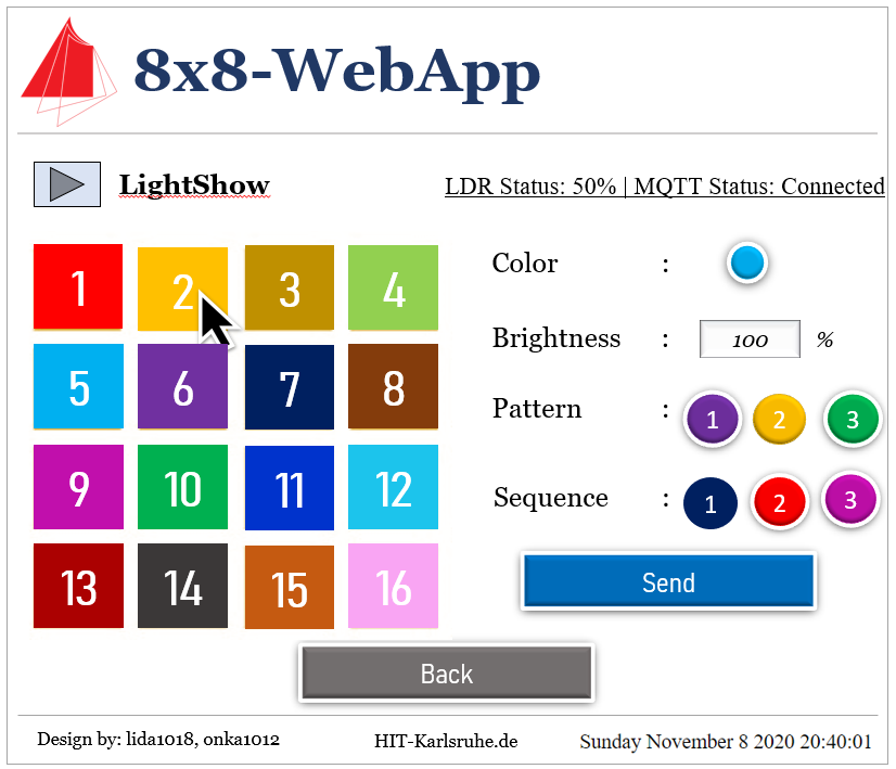 own color, brightness, pattern (pattern shown by 8x8 LED on each ESP32) and sequence (the movement of the 8x8 LED between each ESP32). The user then need to click Send button to