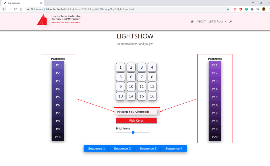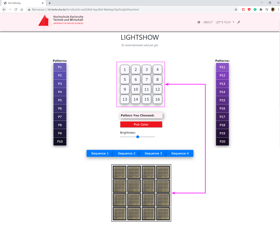 The buttons from 1 to 16 which in the 4x4 matrix form is representing the arrangement of ESP32 sets. User required to pick the sequence from the button P1 to P20. Then user can pick their favourite color from the 'Pick Color' button and brightness from the brightness slider.