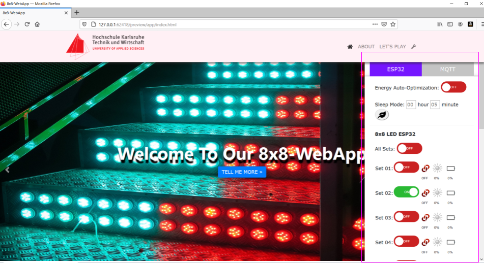 ESP32 sets connection status, switched on or off of the 8x8 RGB LED set, energy optimization function,
