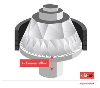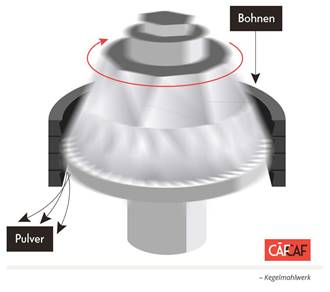 Anstelle von zwei Mahlscheiben kommen dabei Kegel zum Einsatz (siehe