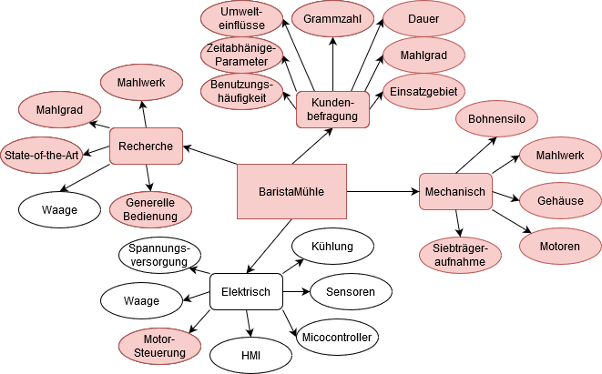Abb.: Mindmap mit markierten Aufgabengebieten der Gesamtimplementierung